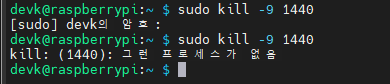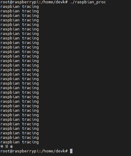 실제 원본 터미널에서 실행 중이던 raspbian_proc 프로세스가 소멸 되었다.