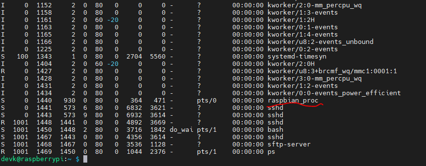 그 다음, 다른 터미널을 열어 ps 진행 raspbian_proc 프로세스 확인이 가능하다.