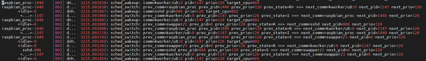 15221 raspbian_proc-1440 [003] d... 3209.088470: sched_switch: prev_comm=raspbian_proc prev_pid=1440 prev_prio=120 prev_state=S ==> next_comm=swapper/3 next_pid=0 next_prio=120