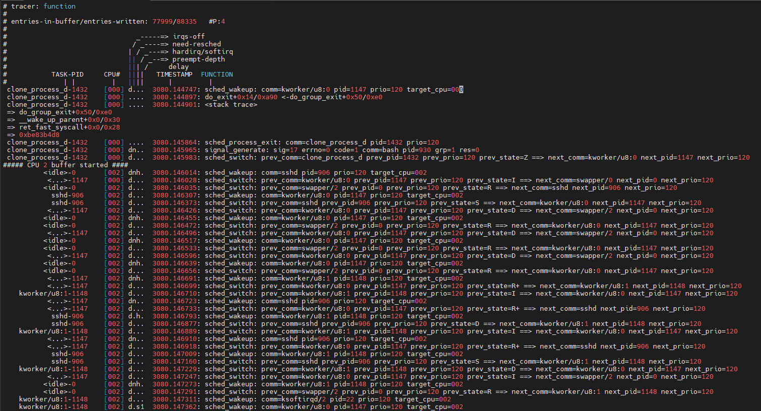 15220 <...>-1147 [002] d... 3209.088466: sched_switch: prev_comm=kworker/u8:0 prev_pid=1147 prev_prio=120 prev_state=I ==> next_comm=sshd next_pid=906 next_prio=120