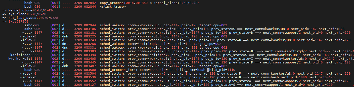 bash-930 [001] .... 3209.082842: copy_process+0x14/0x1860 <-kernel_clone+0xb0/0x43c