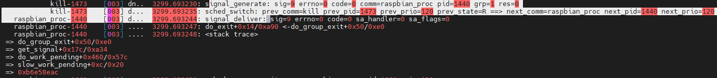 45888 kill-1473 [003] dn.. 3299.693230: signal_generate: sig=9 errno=0 code=0 comm=raspbian_proc pid=1440 grp=1 res=0