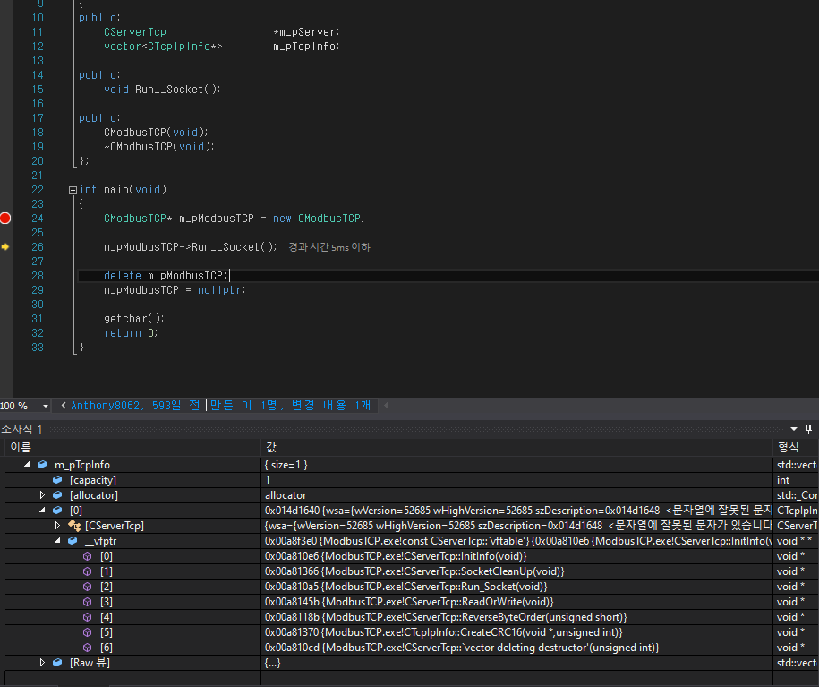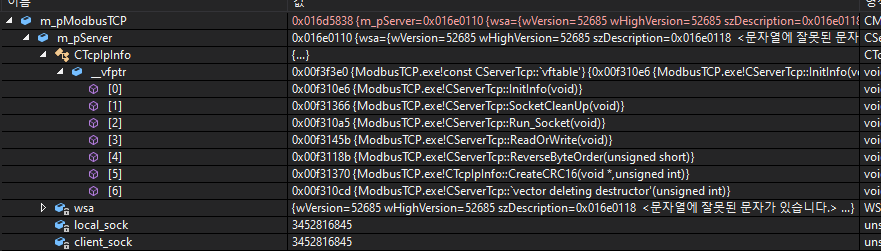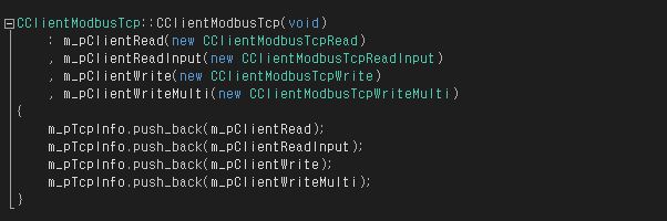 아래의 경우는 CModbusTCP 생성자 부분으로 인해 부모 class에 자식 class 주소가 쓰여진다.