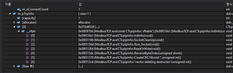 조금 더 자세히 보면, 객체화 된 m_TcpInfo class 의 vfptr 에는 TcpInfo 의 주소 들이 할당 되어있다.