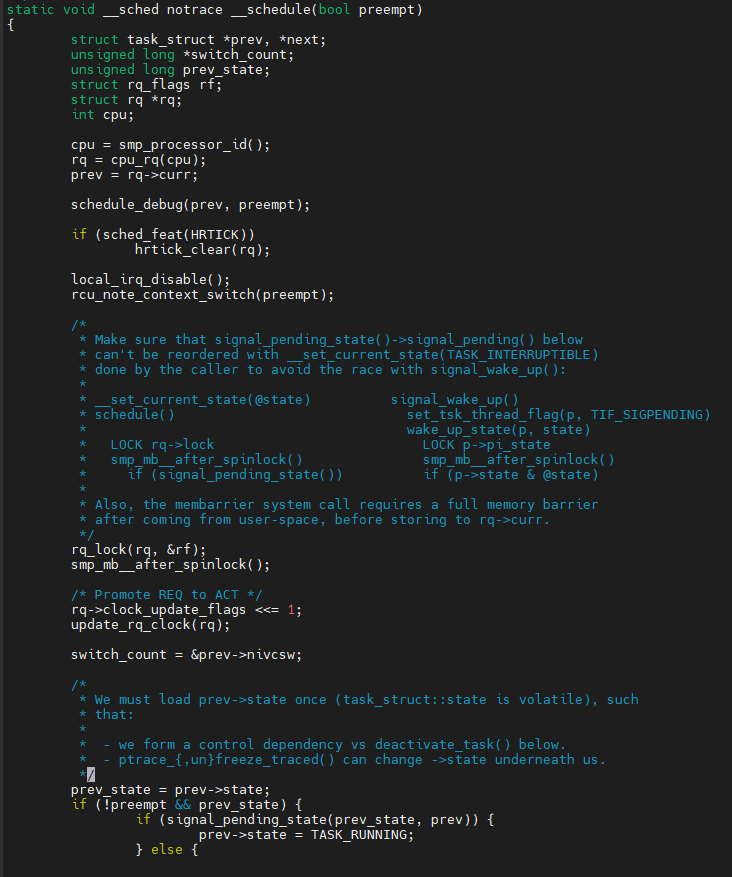 여기서 current 는 현재 프로세스의 task_struct 이다. __schedule 함수에 false 인자는 선점형 스케줄링을 실행 하지 않겠다는 의미이다.