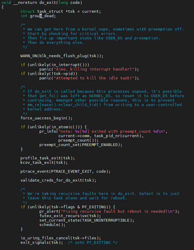 먼저 프로세스 종료의 공통적인 함수로 do_exit 함수가 있는데, 이 세부 동작은 자세히 알 필요가 있다.