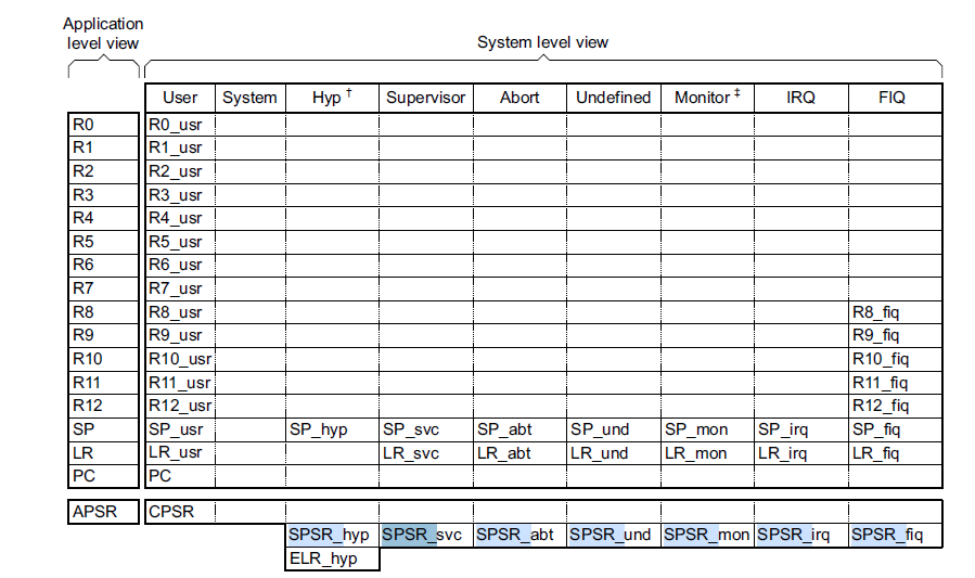 System and User FIQ Supervisor Avort IRQ 등 각 모드별로 사용 되는 Register 들이 조금씩