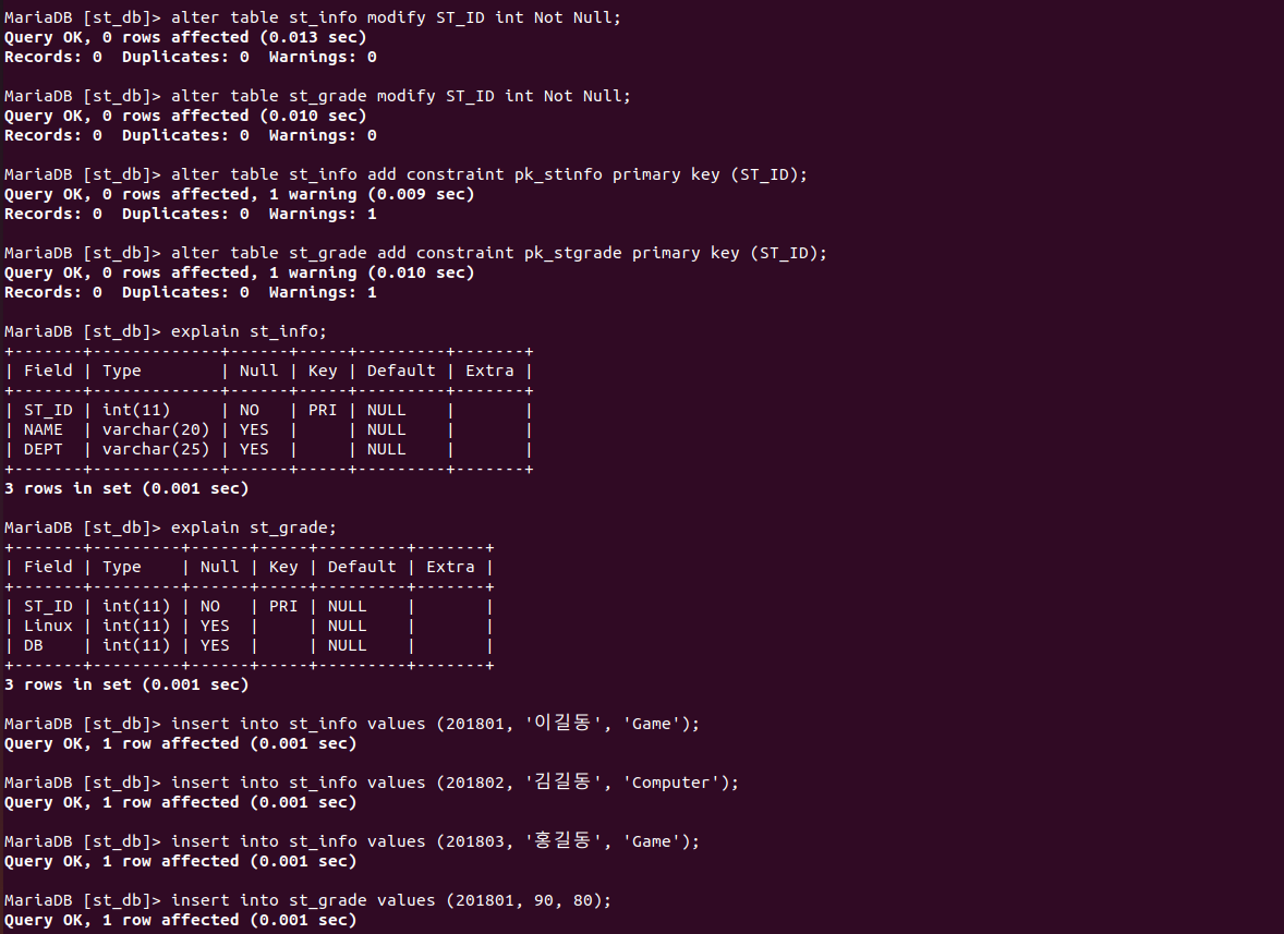 alter 을 통하여 테이블을 수정할 수 있는데 아래는 ST_ID 라는 필드에 int 를 사용 못하게 적용과 기본키로 ST_ID 를 설정하였다.