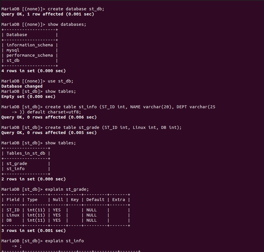 st_db 이름의 database 를 생성하고 DB 안에 st_info, st_grade 테이블을 생성한다.