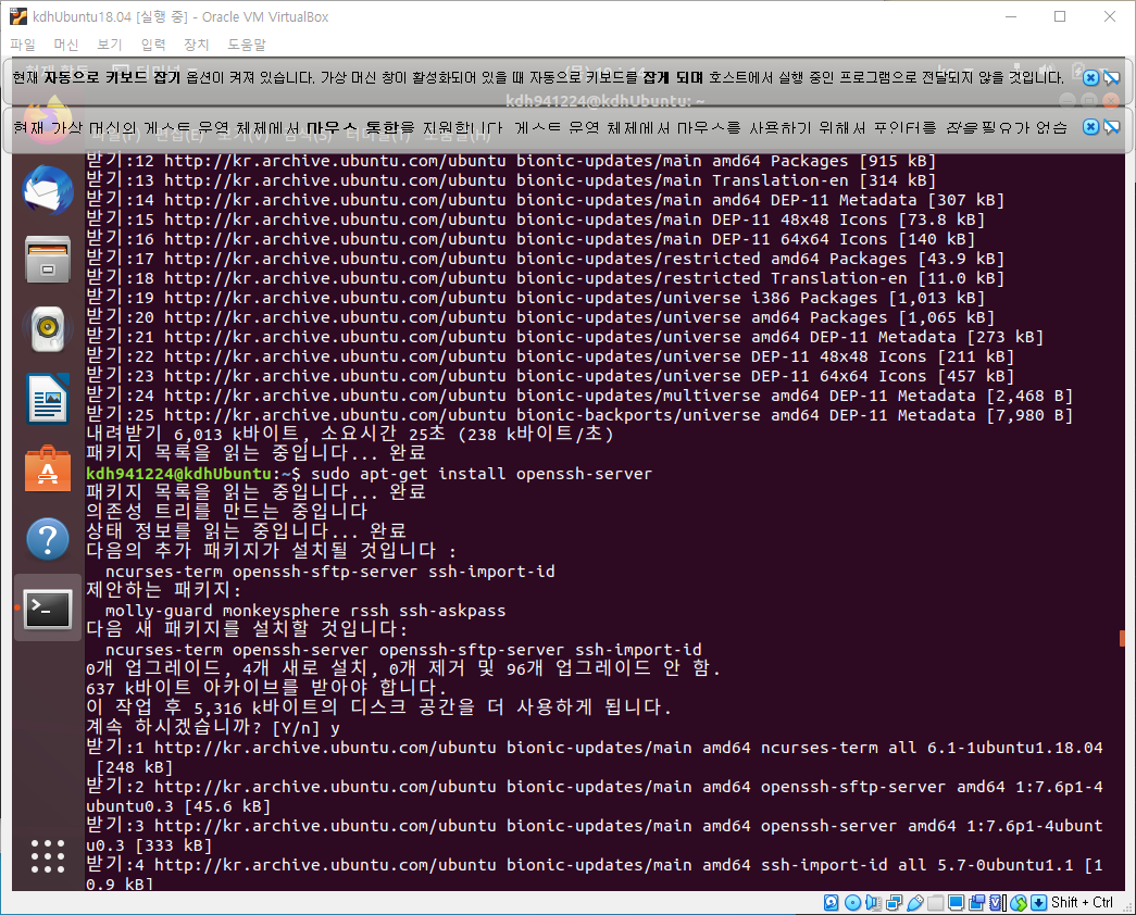 ssh 통신으로 접속을 하려면 ubuntu 가 실행주이여야 하며, ubuntu 가 server 가 되므로 ssh server 가 설치 및 실행되고 있어야 한다.