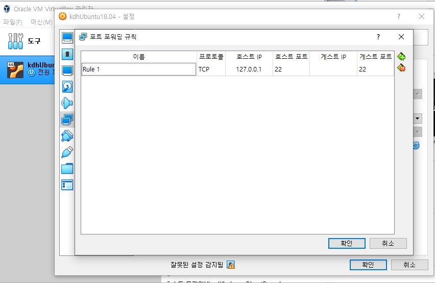 아래는 Oracle VirtualBox에서의 ubuntu 환경설정인데 포팅포워딩이다.