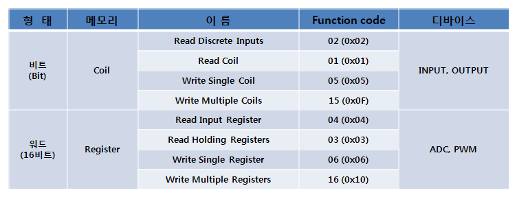 | Register | Holding Resisters | 16비트 워드 | 읽기/쓰기 | 상위장치에서 메모리 읽고, 쓰기 가능 |