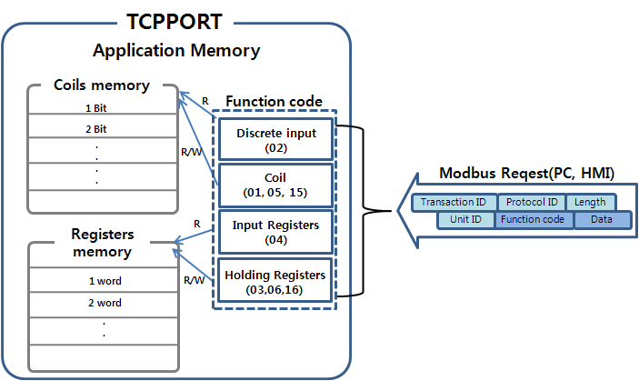 Tcp Port는 16비트 워드영역(Resisters)과 비트영역(Coils)으로 두 개의 데이터 메모리로 나누어져 있다. 여기서 말하는 메모리는 Slave(server)장비의 메모리를 말하며 Master(Client)는 위의 평션코드를 이용하여 Slave(server)장비의 메모리를 읽거나 원하는 값으로 변경할 수 있다.