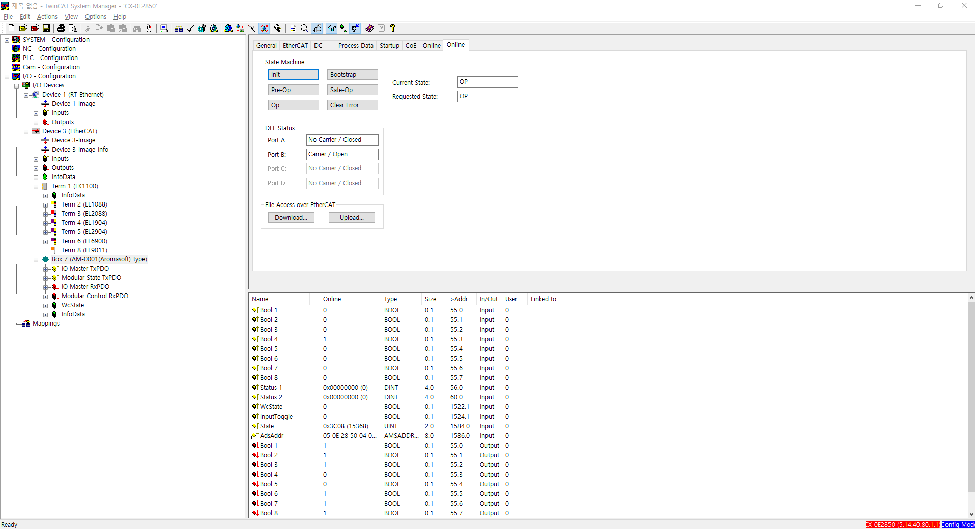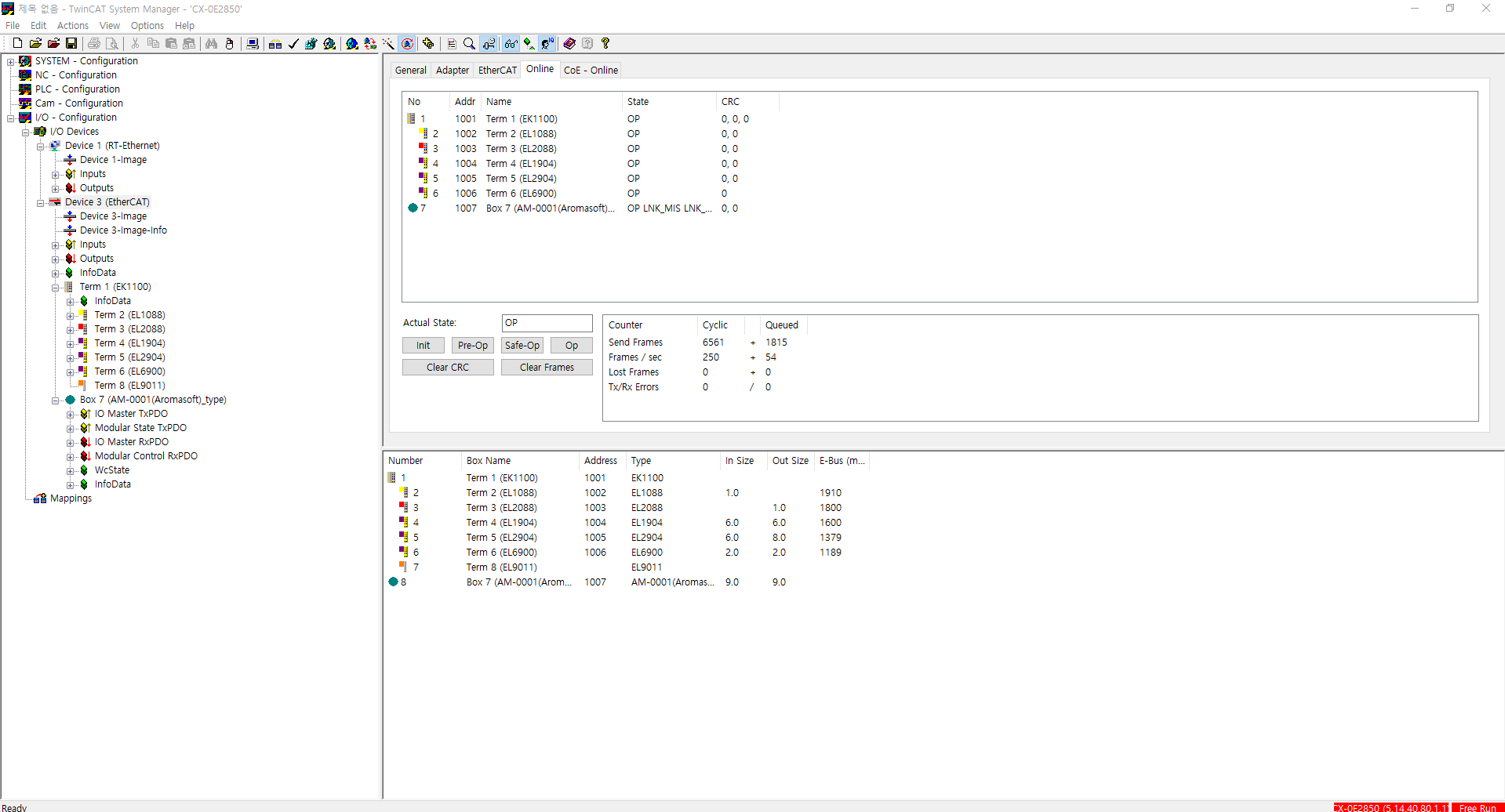 아래는 CX5020 <-> EK1100 <-> EtherCAT I/O Slave Board 의 통신 상태이다.