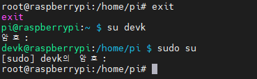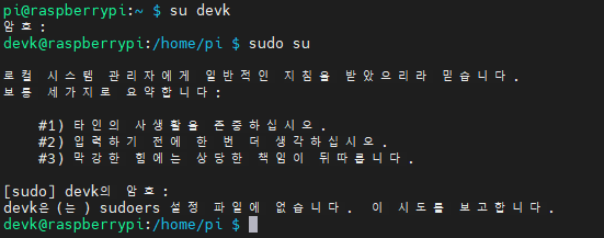 생성 후 해당 계정으로 진입 하여 root 계정으로 전환 시 아래와 같은 메세지를 볼 수 있다.