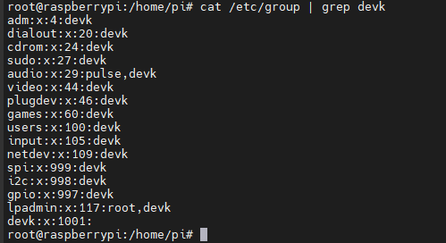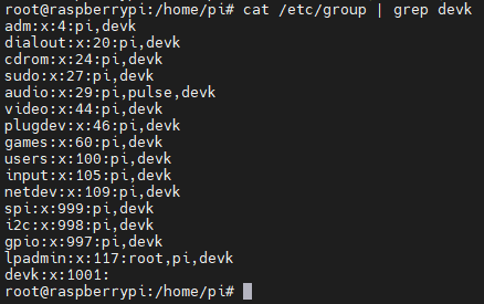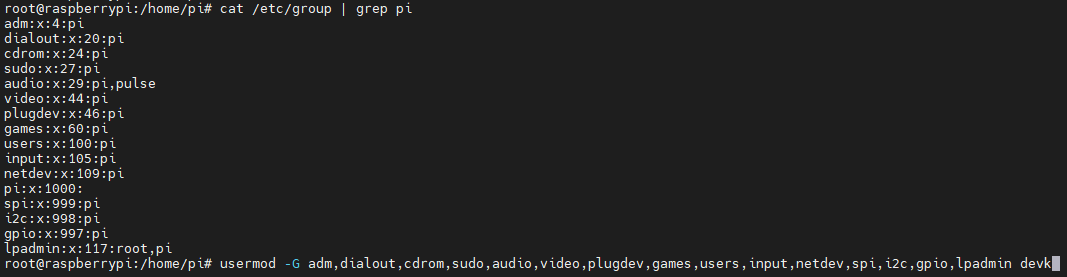 usermod -G adm,dialout,cdrom,sudo,audio,video,plugdev,games,users,input,netdev,spi,i2c,gpio,lpadmin devk