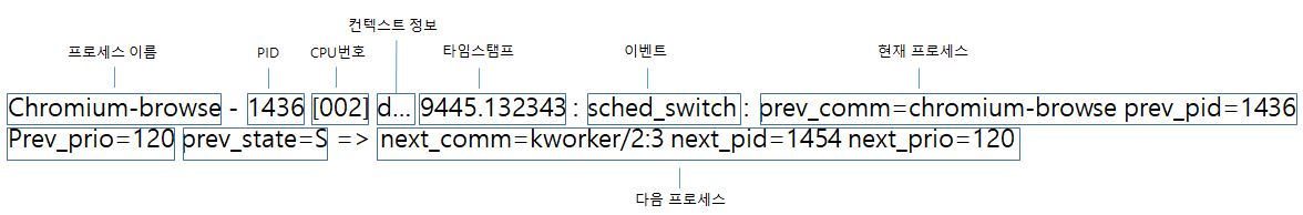즉 Chromium-browse 프로세스에서 CPU2번에 인터럽트는 비활성된 상태이고 9445.132343초에 컨텍스트 스위칭 이벤트가 발생했으며, 현재chromium 우선순의 120번에서 다음 kworker/2:3 프로세스로 컨텍스트 예정인 것이다.