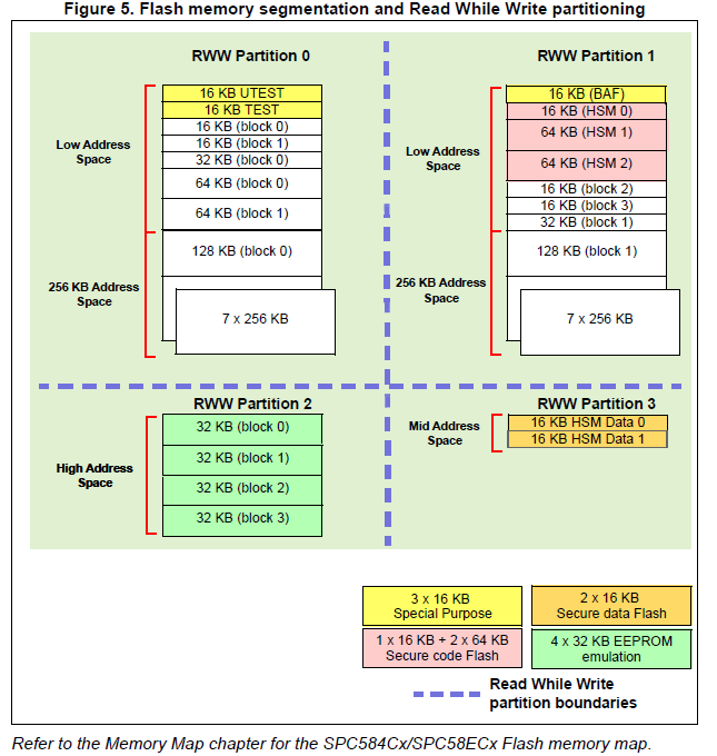 링커 스크립트(ld)를 통해 원하는 해당 심볼을 특정 sector 영역에 할당 가능하다. 영역 설정 후 빌드하여 링커에 의해 원하는 주소에 적재 되었는지 확인하기 위해서 map 파일의 심볼 주소영역을 확인 또는 Trace32 dump 등으로 확인 해야 한다. 즉, object 인 input file 의 section 을 output file 인 elf 와 map 로 어떻게 진행해야 하는지 memory map 을 어떻게 잡는지에 대하여 스크립트로 설정하는 것이다. RWW 인 Read While Write 라고하여 Partition 이 나누어져 있다. RRW0 의 경우 Security 가 아닌 code data flash 영역이며 RRW1 의 경우 HSM code 관련 RRW2 의 경우 EEPROM 등, R..