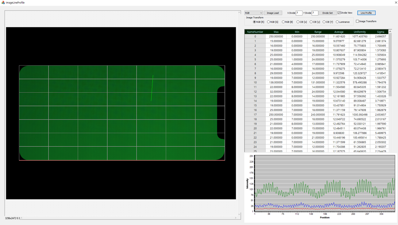 4. LineProfile Button : Button Click 하면 마우스로 이미지에 드래그를 할 수 있으며 드래그된 픽셀영역의 값을 2차원 그래프 x : Position, y = Intencity 로 나타낸다.