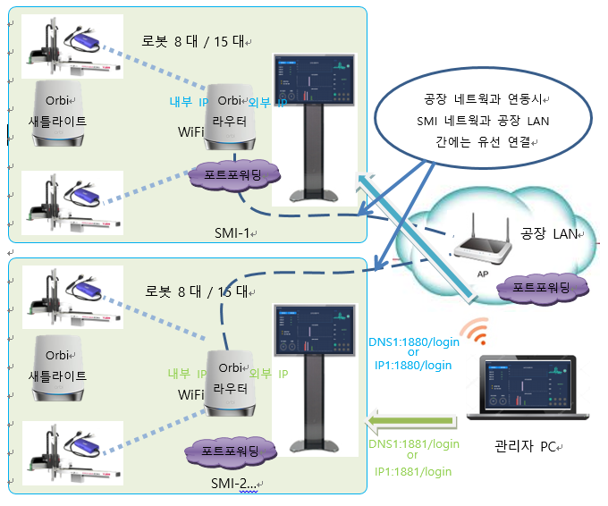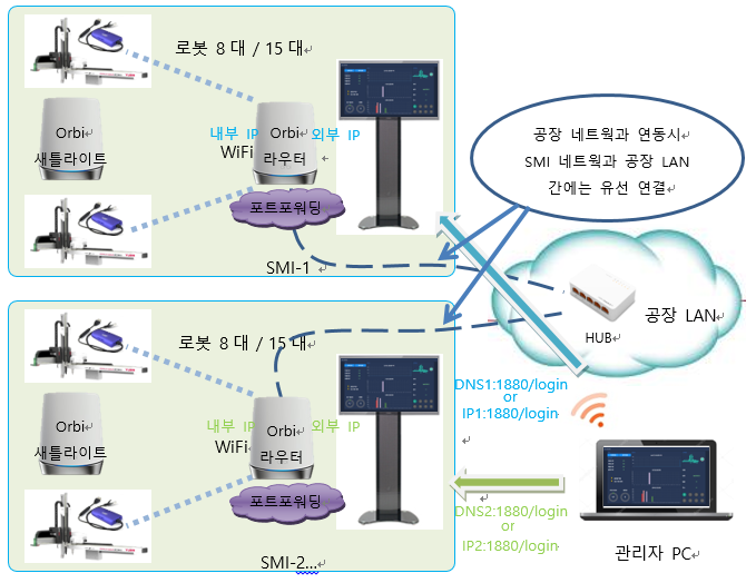 - SMI 접근 허용을 위해 SMI-1, SMI-2 Orbi 라우터 1880, 22 포트포워딩이 필요